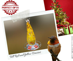 Tall Red and Yellow Daisies Hand Blown Glass Hummingbird Feeder, beautiful and colorful design a perfect and ideal gift for any occasion!