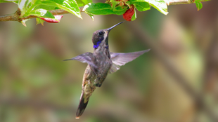 The Brown Violet-ear is a rather large but drab, fairly short-billed hummingbird that breeds at middle elevations in the mountains in Central America, and western and northern South America (primarily the Andes and the tepuis) with isolated populations on Trinidad and in the Brazilian state Bahia.