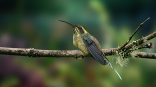 The Fiery-Tailed Awlbill is an uncommon bird native to Brazil, Ecuador, French Guiana, Guyana, Suriname, and Venezuela. Its bill is slightly curved upwards at the tip, a main distinction from other hummingbirds.
