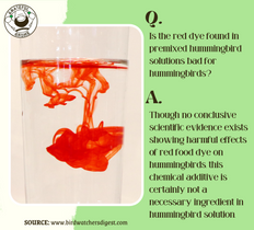Though there is no conclusive scientific evidence that shows the harmful effects of red food dye on hummingbirds, this chemical additive is certainly not a necessary ingredient in hummingbird solution.