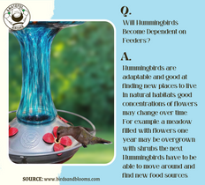Hummingbirds will not become dependent on feeders since they are adaptable and good at finding new places to seek out other sources.