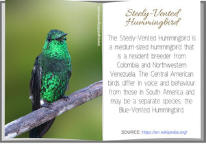The Steely-Vented Hummingbird is a medium-sized, dark hummingbird that is green overall with a dark blue tail. It is a resident breeder from Colombia and northwestern Venezuela.