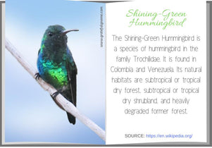 The Shining-Green Hummingbird is an entirely glittering green hummingbird. It is found in Colombia and Venezuela.