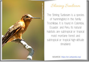 The Shining Sunbeam is a large, dark-brown hummingbird species with a lilac-gold iridescent lower back and rump which found in Colombia, Ecuador, and Peru.