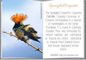 The Spangled Coquette is a tropical hummingbird found in Colombia, Ecuador, Peru, and Venezuela.