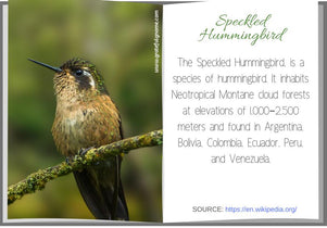 The Speckled Hummingbird is a small brownish hummingbird species with distinctive black cheek and pale buffy eyebrow. It is found in Argentina, Bolivia, Colombia, Ecuador, Peru, and Venezuela.