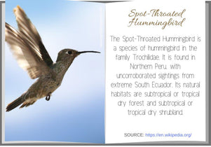 The Spot-Throated Hummingbird is a large, drab hummingbird. It has dull green upperparts, light gray underparts, green flecks on the throat, and a white spot behind the eye. It is found in northern Peru, with uncorroborated sightings from extreme south Ecuador.
