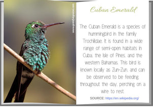 The Cuban Emerald is a hummingbird species that is very common throughout Cuba and the surrounding islands. It is locally known as Zun-Zun.