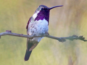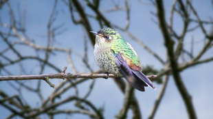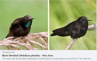 The Purple-Backed Sunbeam is a blotchy hummingbird restricted to a tiny, remote area in the Andes of northern Peru. It has a bronzy-brown plumage with irregular white patches on the face, throat, and white teardrop-shaped spots on breast.