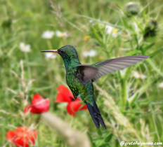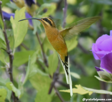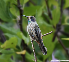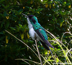 The Purple-Bibbed Whitetip is a hummingbird species found in Colombia and Ecuador. Both sexes are mostly green with a short, white line behind eye.